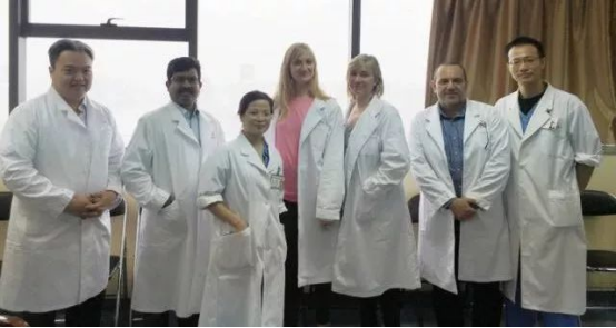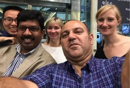 11月5日深夜到达广州白云机场,从左到右依次为:我院胸外科医生李京沛、Glenfield医院胸外科顾问医生Sridhar Rathinam、高年资麻醉助理Lorraine Jones、顾问麻醉医生Amr Elsissi、高年资手术室助理Beth Sursham
